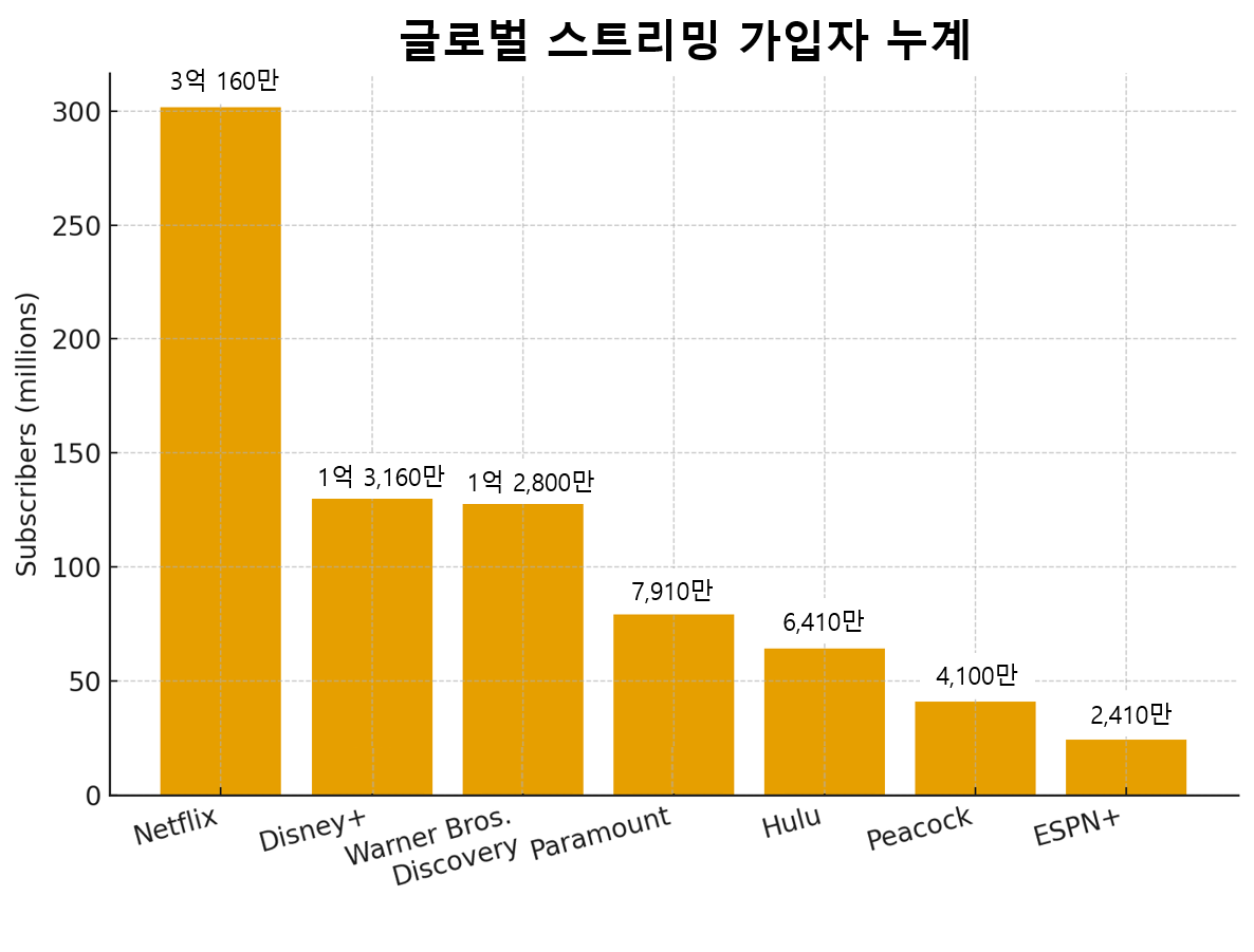 · 2위 그룹은 디즈니+ 1억 3,160만 명, 워너브라더스 디스커버리(WBD) 1억 2,800만 명으로, 각각 분기 순증 380만 명, 230만 명을 기록